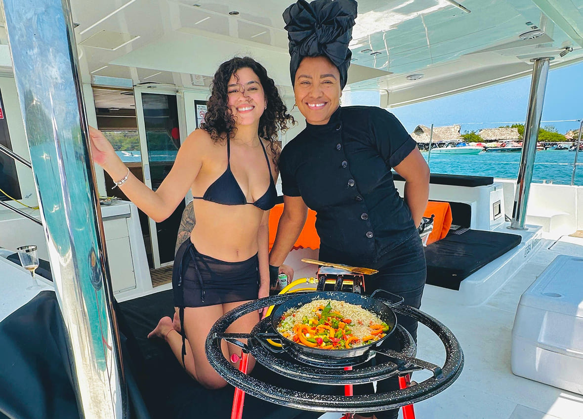 Los comensales observan, aprenden, participan y finalmente disfrutan de una paella artesanal servida al atardecer, acompañada de vino o sangría y del paisaje inigualable del Caribe colombiano.